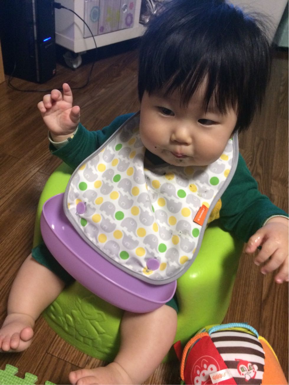 ご飯用のスタイを嫌がって引っ張ってブンブン! でもそのスタイの中にはごはん粒とか口からこぼれたものがいっぱいなんだヨゥー だからブンブンっとするたびにご飯粒もあっちゃこっちゃに飛び散る……(-_-) やめろ〜〜っっ とってはわたしが付け直す。 とる。 直す。 の攻防戦。 最終的に、わたしが負ける(;_;) ご飯終わらない(-_-) でもさ、じゃあハンカチならいいかと思って襟首にかけるも、 すぐとる。 仕方なくそのままあげるとやっぱり服にぽとっ 人参とかだとオレンジ色がついて速攻で洗剤で落とさないと落ちなくなるから。 余計な仕事が増えるよね!(-_^) 首回りが苦しく感じるのかな?っと思って。 コンビに変えてみたら そこそこおとなしく。 でも受け皿が気になるのでそれに気が散ってしまいなかなか進まない。 まぁしゃーない。 |
